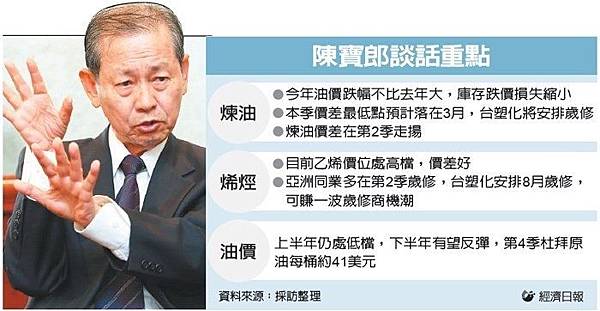 陳寶郎指出,亞洲煉油廠集中在第2季歲修,原油需求降低,歲修潮將加重產油國的壓力,他評估國際油價有望在下半年反彈,估計到第4季,杜拜原油價格將站上41美元。