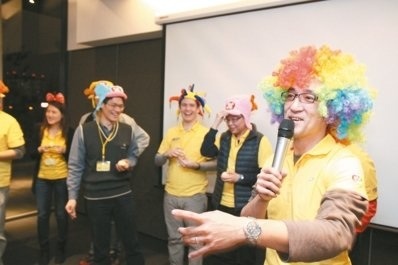 「這個月的壽星站出來!」戴著花色頭套的台中市機械二代聯誼會活動長傅彥凱賣力的在台上導引活動進行,他笑語不斷,讓台下同是二代的百餘會員笑得捧腹,熱鬧氣氛彷彿是一場大學的迎新活動。