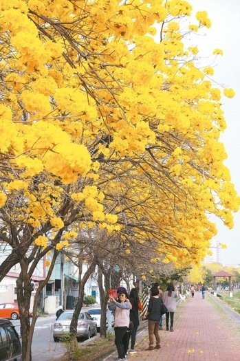 嘉義市政府八掌溪畔舉辦「花現我嘉」活動,去年黃金風鈴木花兒大爆發,花團錦簇,今年氣候異常,花況不如預期。 記者魯永明/攝影、報系資料照