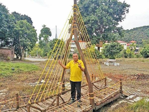 旗山南勝社區理事長張忠雄為吸引遊客,以荔枝木搭建,取名「勝荔斜張橋」。 記者謝梅芬/攝影