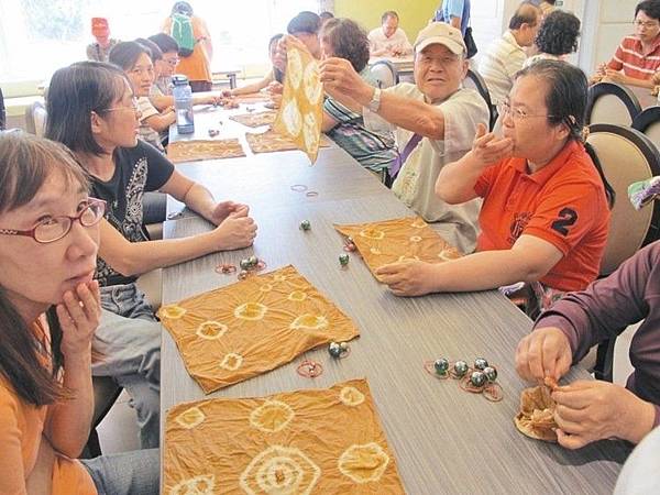 假日不少遊客進入農村,體驗荔枝染布DIY,利用橡皮筋和玻璃珠將棉布綁成各式形狀,放入染汁熬煮,自己做的自己熬,遊客玩得很開心,其中一位王先生還說要將自己的作品義賣,所得要捐給天鵝堡幫助憨兒們,揪甘心。