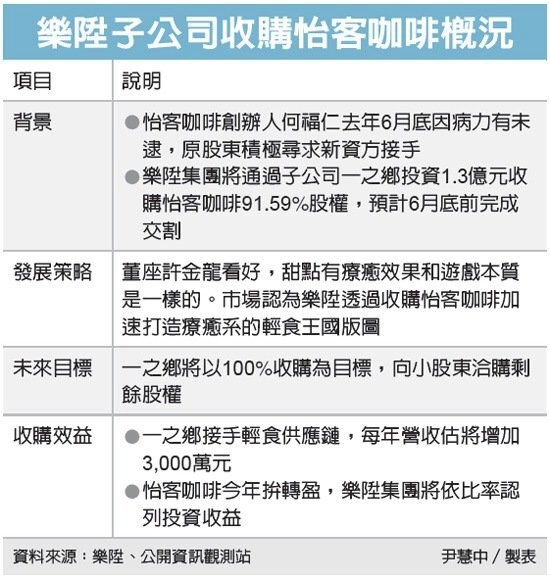 樂陞去年以一點三九億元全資收購一之鄉後,一之鄉順利擺脫虧損。樂陞看好,收購怡客咖啡絕大多數股權後,一之鄉有望增加近六十間通路,新設甜點吧將為旗下經典蜂蜜蛋糕及與LINE合作的授權禮盒增加逾倍銷售量。
