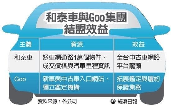 日本最大購車網品牌Goo net來台搶攻中古車市場,將與和泰車旗下@bc好車網結盟,結合和泰車中古車網路,成為全台中古車通路龍頭,並將進一步發展認證與履約保證業務。