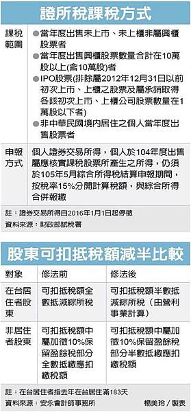 納稅人若在去年處分三類股票:包括未上市櫃股票、興櫃股票達100張以上、以及出售2013年以後IPO公司股票,且以「承銷方式」取得股票並出售十張以上者,全都要核實課稅,持股在一年以上稅率12%、持股滿一年為7.5%、滿三年是3.75%。