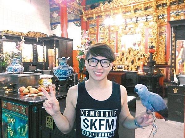 崇右技術學院學生林暐傑帶鸚鵡到城隍爺前道謝。 圖/高嘉和提供