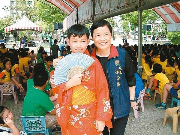 蟠桃國小昨辦家庭教育日,男學生反串穿日本和服吸引眾人目光。 記者翁浩然/攝影
