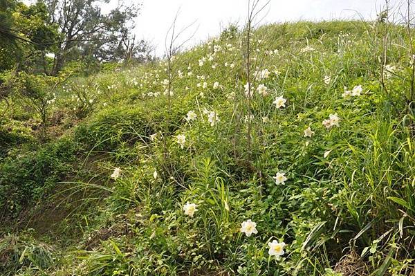 後龍大山一處濱海坡地近日野百合盛開,舊砲台旁也可見百合綻放。記者張裕珍/攝影