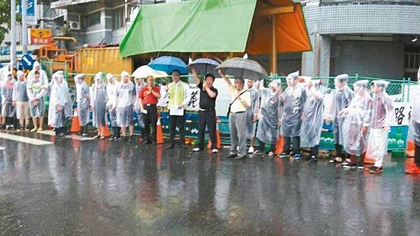 南投市中興路分隔島兩旁路地,一直沒有徵收,引起地主反彈,昨天冒雨在路旁抗議。 圖/張家樂