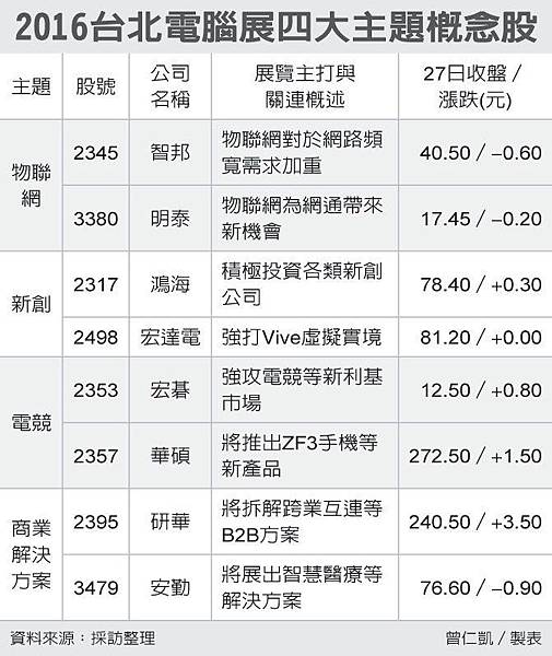 分享2016台北國際電腦展(Computex)即將於31日登場,今年主辦單位主打「物聯網」、「新創」、「電競」與「商業解決方案」等四大主題,國內華碩、宏達電、宏碁等科技業者力拚轉型升級。