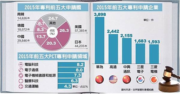 世界智慧財產組織日前公布2015年專利申請報告,去年共接受21.8萬件申請案,其中美國再度奪冠,件數占比為26.3%;中國大陸雖落後美、日,屈居第三,但對岸華為企業與中興通訊在申請企業中分居第一名和第三名,顯見陸方近年鼓勵發展專利已有顯著成績。