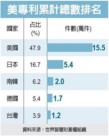 分享截至2015年為止,根據美國專利及商標局統計,台灣在美國擁有1.2萬件專利,僅次於美國、德國、日本和韓國;奧睿事務所律師張亞樵表示,台灣代工製造業深藏不露,有相當多技術專利,卻不善於活化,讓這些專利變為有利於企業的商業策略之一,實屬可惜。