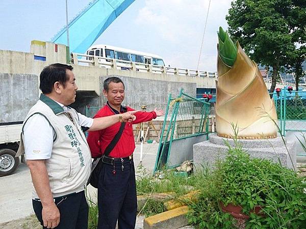 江北里長謝祚敏表示,週邊整體景觀改造工程還在進行中,右邊是要施作景觀台,還有一些歷史人文的呈現,不過,看向另一邊,好吸睛,大大的筍子矗立在這,要展現地方特色,主要是因為,這裡是昔日的渡船頭,以前基隆河岸特殊地理環境,沿岸是一大片的竹林,出產特有的沙筍,所以,在這裡的江北橋入口意象中,就特地拿出以前的照片對照,做出這大型沙筍,也馬上成了地標,只是週邊工程還在做,地方也希望加緊趕工。