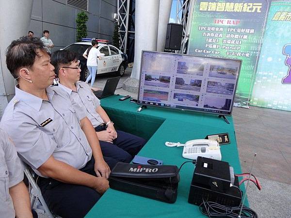 嘉義市警局全國首創「行動派出所2.0-雲端智慧巡邏車」啟動儀式,現場臨時設置的勤務中心電腦螢幕即時接收巡邏車上傳雲端治安現況影像。 記者魯永明/攝影