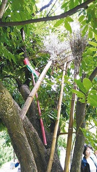 飛天掃帚? 日本庭園大師北山安夫昨天前往台南公園會勘,途中驚見樹上掃帚,直呼「不可思議」。 圖/社大提供