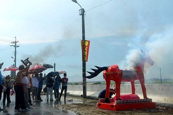 台南市後壁區崁頂里勸善堂射火馬民俗文化祭典,相傳已有百年歷史,是全台唯一特有民俗文化祭典,下午冒雨登場,信徒奉獻火馬多達34隻更勝往年,以竹架結構紙糊塑成的馬匹,內部裝置蜂炮及煙火,引燃後煙灰竄起直達雲霄,藉此感念池王爺恩威,犒賞告慰亡靈。