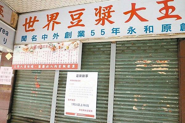中正橋頭的世界豆漿大王總店,店前經常大排長龍,還是不少大陸觀光客來台必到的小吃。昨天消費者上門,卻發現鐵捲門全部拉下,除張貼國稅局的公告外,業者也張貼了道歉啟事,向消費者致歉,強調26日將重新營業。