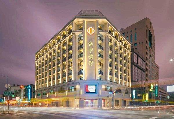 台中商業銀行總行外牆磁磚脫落,業者整修拉皮後啟用,入夜後加上景觀燈,展現迷人風情。 圖/台中商銀提供