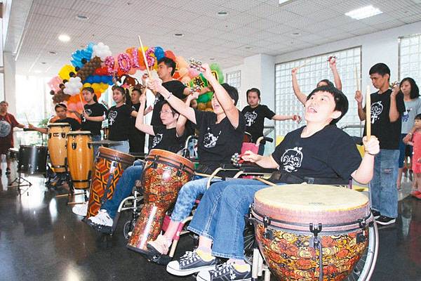 財團法人彰化縣私立基督教喜樂保育院生也練非洲鼓,昨天在漢銘醫院展現練習成果,雖然一首曲子就得練三個月,但學員受到音樂薰陶,相當快樂。