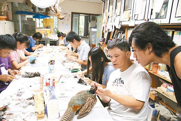 姚正得先試範如何製作鳥類標本,接著帶學生參觀標本室逾萬隻鳥類標本,第三天實際操作,迄今已培育逾200名學員。