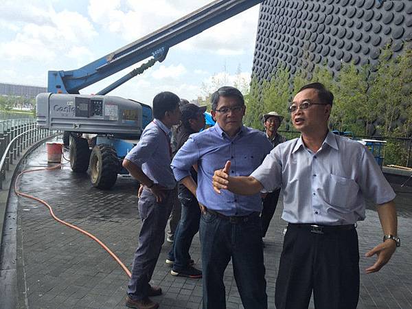 內政部政務次長花敬群(右2)上午到故宮南院關心漏水修繕進度,由營建署南區工程處長吳瑞安(右)一一解說。記者黃煌權/攝影