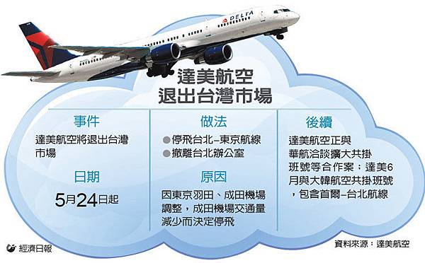 民航局官員今天證實達美航空已知會5月分要停飛台北-東京航線,等於退出台灣市場,但是達美尚未提出正式申請,停飛細節仍由達美公布為準。