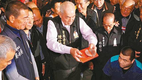 值年爐主陳信安(中)等人代表擲筊,向白沙屯媽祖請示今年進香的重要時辰。 圖/白沙屯媽祖婆網站提供